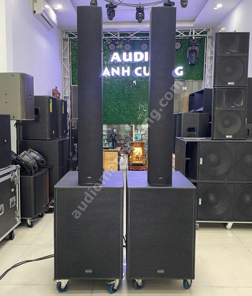 Gợi ý hình ảnh: Bạn có thể chèn hình ảnh một dàn loa cột đang được lắp đặt trong một không gian thực tế như phòng khách hoặc một quán cafe, để thể hiện tính thẩm mỹ cao của sản phẩm.