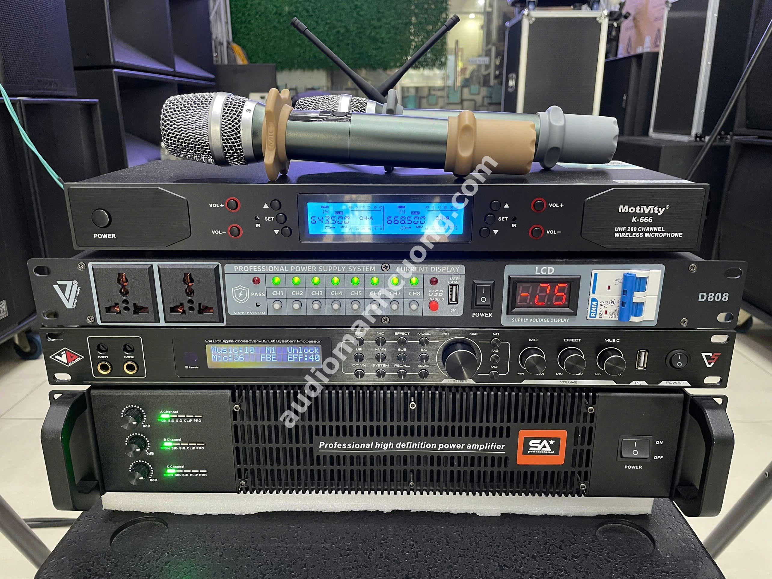 Điểm cộng của combo này là cục đẩy 3 kênh SA, cho phép tách riêng công suất loa và sub, đảm bảo sự ổn định suốt quá trình vận hành. Bộ trung tâm xử lý vang số JD V5 mang đến chất âm trong trẻo, tái tạo giọng hát mượt mà, hỗ trợ chống hú hiệu quả. Bộ micro không dây Motivity K-666 lại cho dải bắt tiếng rộng, hát nhẹ, lên cao không bể tiếng – rất hợp cho gia đình.